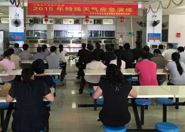 因北海天氣多變,特殊天氣隨時可能發(fā)生,為防止隨時可能出現(xiàn)的特殊天氣對園區(qū)安全帶來不利影響,確保園區(qū)設(shè)備財產(chǎn)的正常運轉(zhuǎn)、安全,確保園區(qū)安全生產(chǎn)零事故,同時為讓員工熟悉應(yīng)對特殊天氣的工作流程,做到工作有計劃性、準備工作及時到位、突發(fā)事件處理及時,園區(qū)物業(yè)公司(中電瑞達)于2015年6月9日下午,組織公司全體人員開展了一次特殊天氣應(yīng)急演練。整個演練分為:特殊天氣應(yīng)急預案培訓、特殊天氣應(yīng)急演練兩大部分。為確保此次演練順利進行,物業(yè)公司積極準備,專門組織各部門負責人召開專題會議,完善方案、物資準備,部署每個演練環(huán)節(jié),明確人員分工、時間節(jié)點、演練流程。